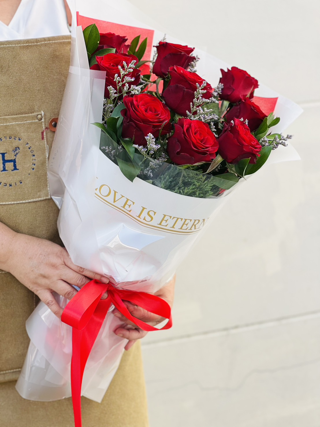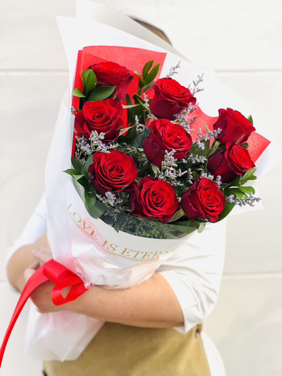 Prepare for valentines day with precious bouquet. A fresh 9 red roses are arranged in hand tie style. Start a good day with delightful and glamorous flowers. Lets flower speak for you. tag: ดอกไม้วาเลนไทน์, ดอกไม้ Valentine